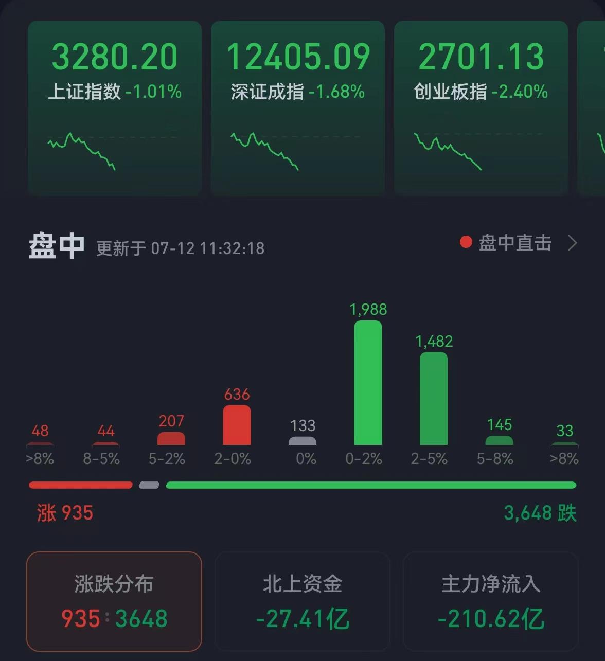 周二(7月12日),三大股指震蕩回落,全線收陰,跌幅均超1%。截至上午收盤,上證指數(shù)跌幅達1.01%,報3280.2點,失守3300點整數(shù)關(guān)口;深證成指和創(chuàng)業(yè)板指跌幅分別為1.68%和2.40%;滬深兩市合計成交額6183.5億元;總體來看,兩市個股跌多漲少,上漲個股935只,有3648只個股下跌。