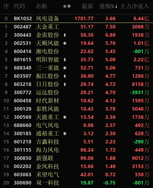 從領(lǐng)漲的風(fēng)電設(shè)備行業(yè)看,截至7月15日11:30,行業(yè)交易中的20只個股,有19只上漲,有6只個股漲幅超5%。從資金流向看,風(fēng)電設(shè)備行業(yè)上午大單資金凈流入額達(dá)6.44億元,居各行業(yè)第5位。