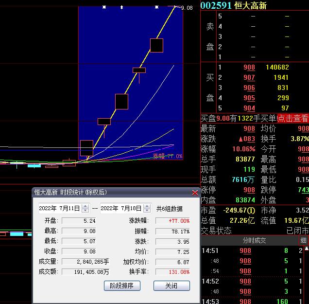 7月18日,熱門股恒大高新再度漲停,截至收盤,報9.08元,連續(xù)6個交易日漲停,期間累計漲達(dá)77%。