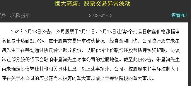 7月18日,恒大高新發(fā)布股票交易異常波動公告。