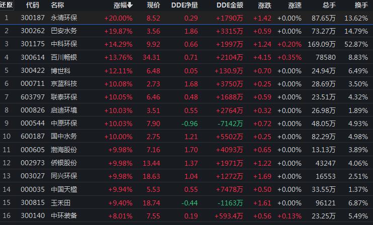 7月18日,環(huán)保行業(yè)漲幅居前,達(dá)4.59%。其中,包括中原環(huán)保、聯(lián)泰環(huán)保、永清環(huán)保、國中水務(wù)、渤海股份、京藍(lán)科技、同興環(huán)保、巴安水務(wù)等在內(nèi)的12只環(huán)保股集體漲停。