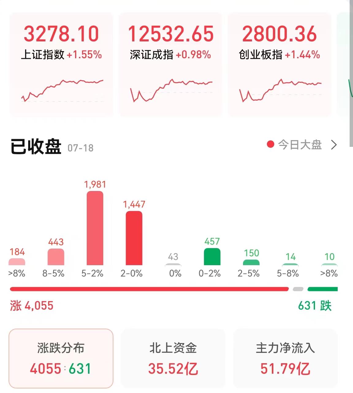 7月18日,三大股指全線上漲,截至收盤,上證指數(shù)漲幅1.55%報3278.1點(diǎn),深證成指漲幅0.98%報12532.65點(diǎn),創(chuàng)業(yè)板指漲幅1.44%報2800.36點(diǎn);兩市合計成交10214億元,北向資金凈買入35.52億元??傮w來看,兩市個股漲多跌少,超4000只個股實(shí)現(xiàn)上漲。
