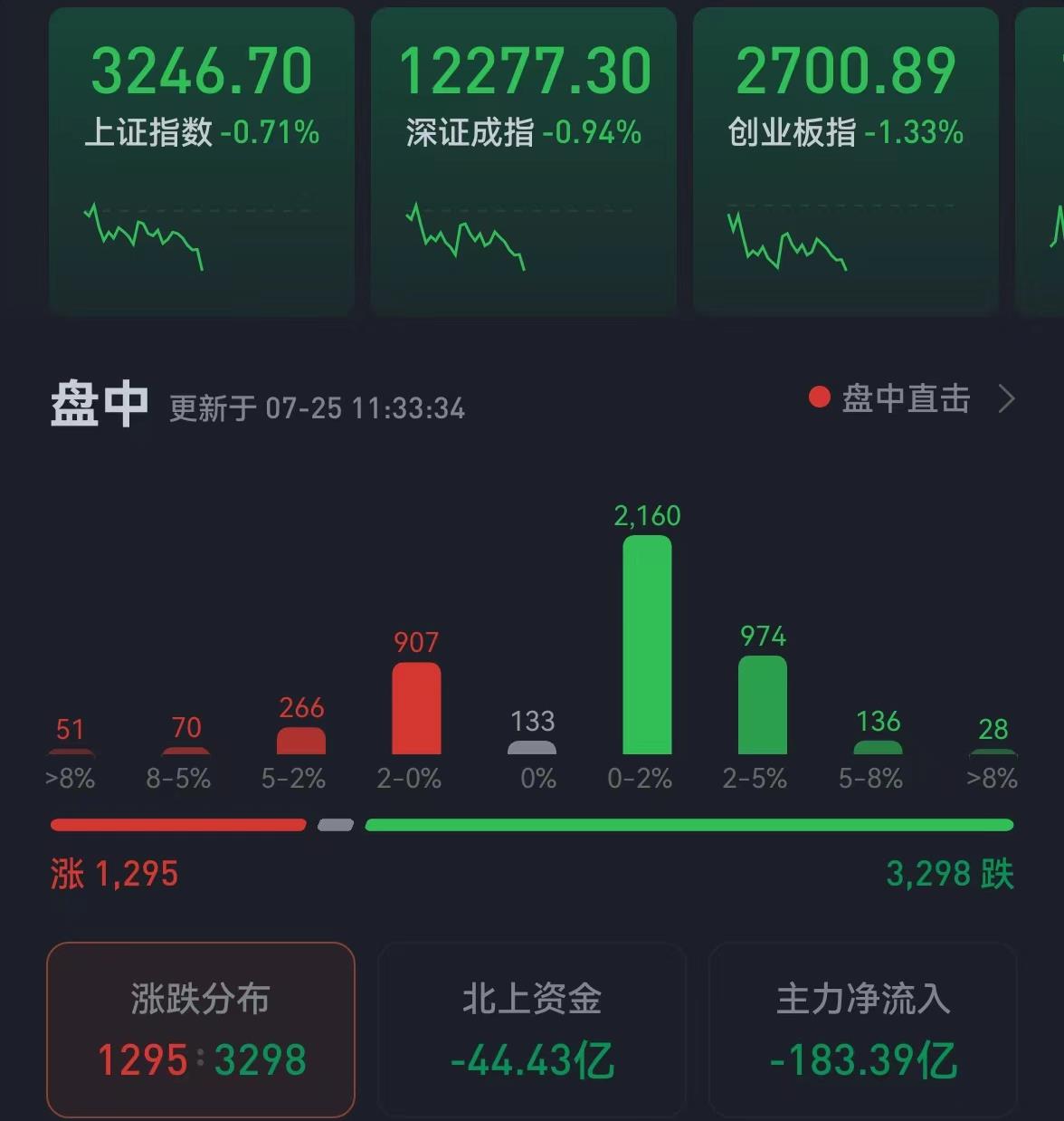 周一(7月25日),三大股指震蕩回落,全線收跌。截至上午收盤,上證指數(shù)跌幅達0.71%,報3246.7點;深證成指和創(chuàng)業(yè)板指跌幅分別為0.94%和1.33%;滬深兩市合計成交額5491億元??傮w來看,兩市個股跌多漲少。