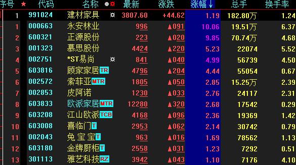 具體來看,截至7月25日上午收盤,建材家具板塊漲幅居首達1.19%,其中,永安林業(yè)、正源股份等2只概念股攜手漲停。