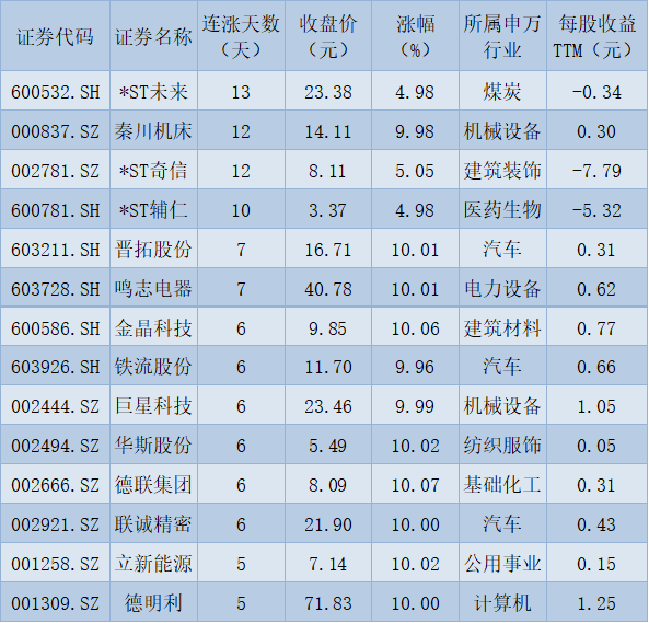 表:連續(xù)上漲5天且今日收盤(pán)漲停股一覽