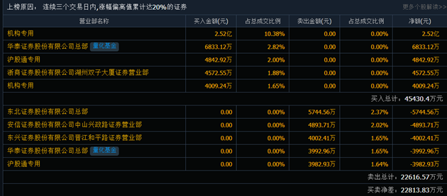 鳴志電器8月2日登上龍虎榜,同花順數(shù)據(jù)顯示,機(jī)構(gòu)專(zhuān)用賬號(hào)買(mǎi)入25172.57萬(wàn)元,該賬號(hào)買(mǎi)入后,次日上漲概率50%,平均盈利0.42%。收益率最高的是持股1天后賣(mài)出,收益率0.42%,成功率50%。華泰證券股份有限公司總部買(mǎi)入6833.12萬(wàn)元,該營(yíng)業(yè)部買(mǎi)入后,次日上漲概率46%,平均盈利-0.02%。收益率最高的是持股1天后賣(mài)出,收益率-0.02%,成功率46%。
