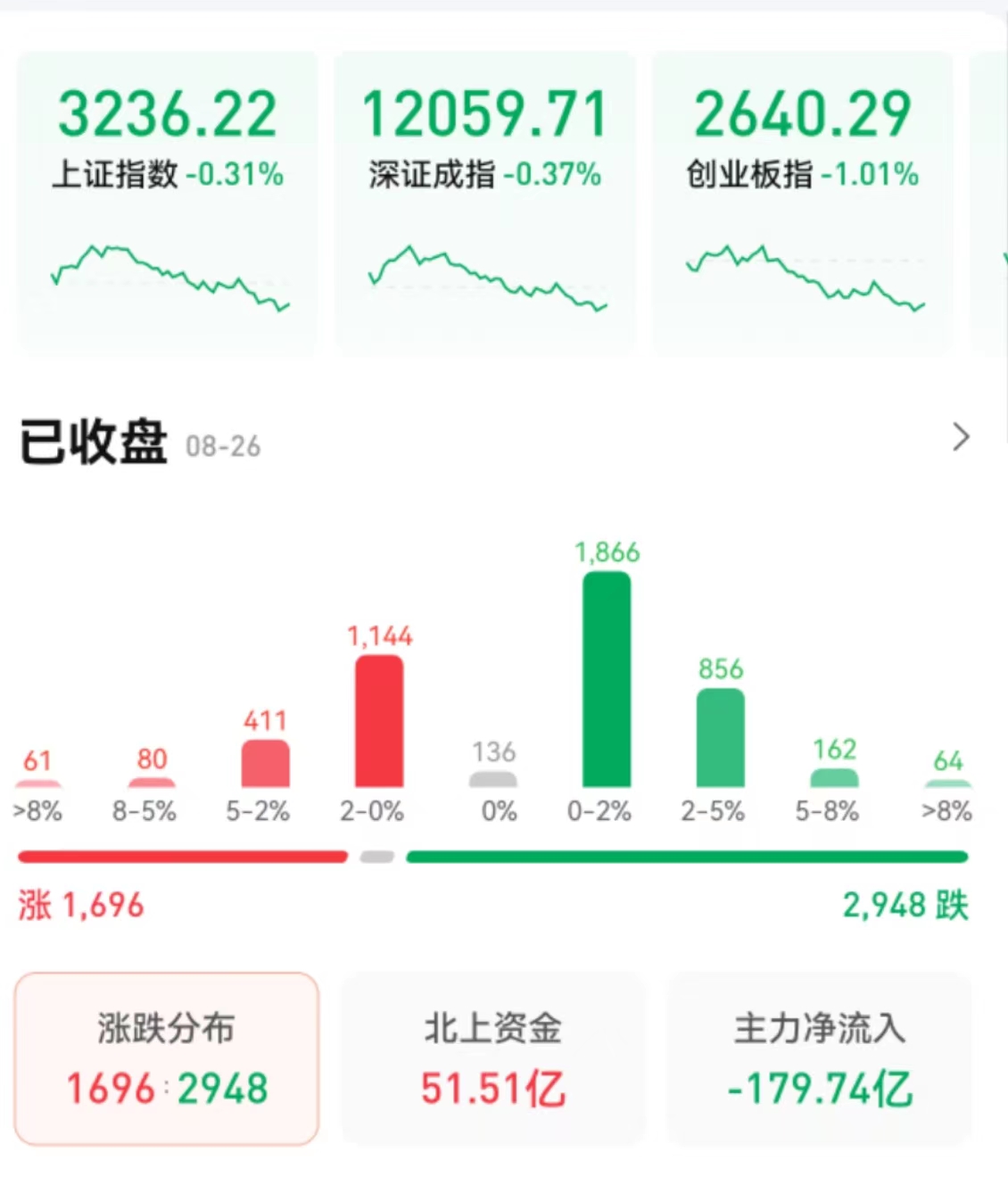 8月26日,A股三大指數(shù)集體收跌,截至收盤,上證指數(shù)跌0.31%報3236.22點,深證成指跌0.37%報12059.71點,創(chuàng)業(yè)板指跌1.01%報2640.29點;兩市合計成交9292億元,北向資金凈買入51.51億元??傮w來看,A股個股跌多漲少?;仡櫛局苋笾笖?shù)的走勢來看,上證指數(shù)期間累計跌0.67%,深證成指期間累計跌2.42%,創(chuàng)業(yè)板指期間累計跌3.44%。