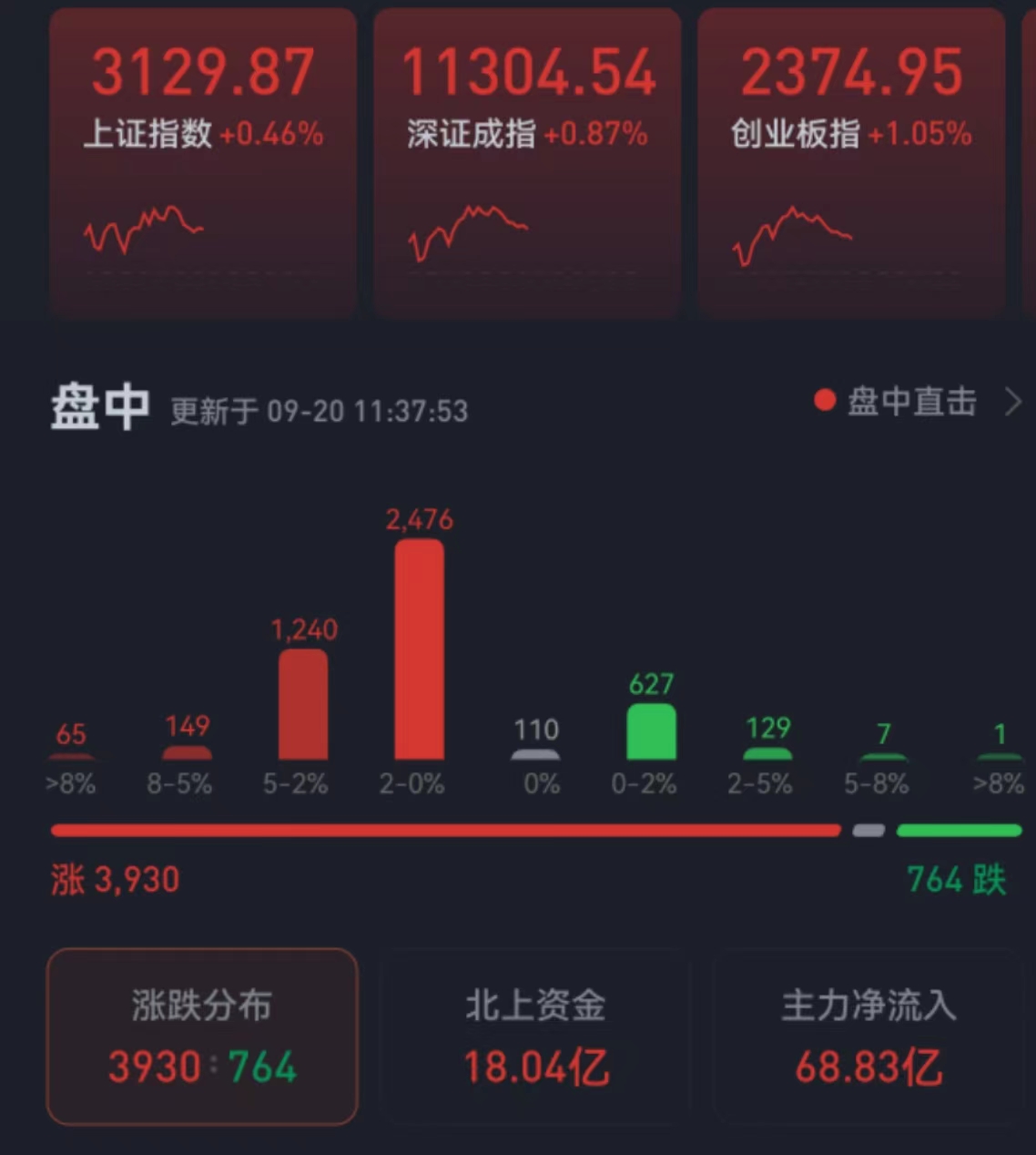 周二(9月20日),三大股指震蕩反彈,全線飄紅。截至上午收盤,上證指數(shù)漲0.46%,報(bào)3129.87點(diǎn);深證成指和創(chuàng)業(yè)板指漲幅分別為0.87%和1.05%;滬深兩市合計(jì)成交額4213億元,總體來看,兩市個(gè)股漲多跌少,近4000只個(gè)股實(shí)現(xiàn)上漲。