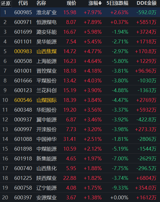 9月29日,申萬一級行業(yè)中煤炭行業(yè)領(lǐng)漲,漲幅達(dá)2.35%,獲得2.99億元大單資金的凈流入。行業(yè)38只交易中的個股,有31只上漲,占比81.58%,其中,4只個股漲幅超5%。