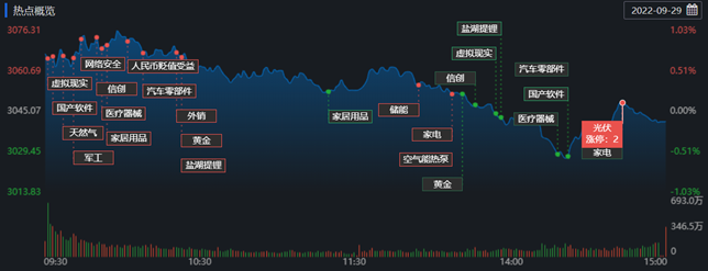 截至9月29日收盤,上證指數(shù)跌0.13%,收報3041.20點(diǎn),深證成指漲0.18%,收報10919.44點(diǎn),創(chuàng)業(yè)板指漲0.83%,收報2333.00點(diǎn);滬深兩市合計成交額6245.7億元,較前一交易日縮減3.50%;北向資金凈買入34.29億元;總體來看,A股中上漲個股為1638只,下跌個股3173只。