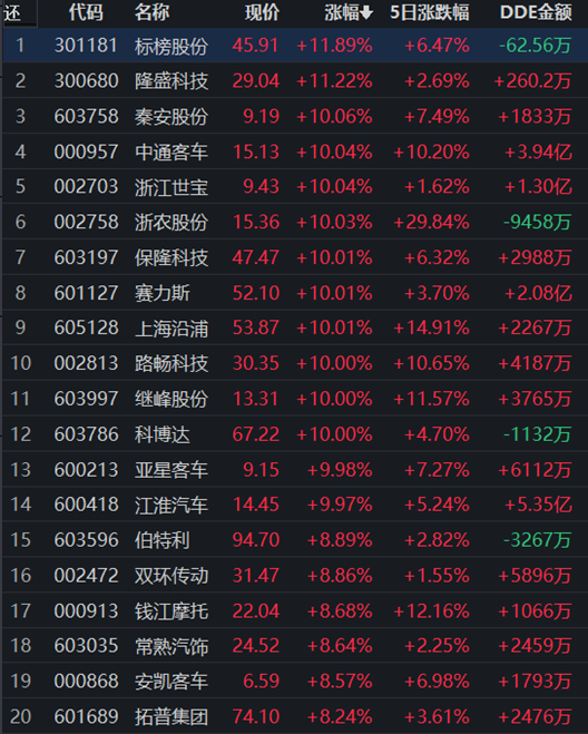 具體來看,汽車行業(yè)領(lǐng)漲,漲幅達3.31%,獲得23.26億元大單資金的凈流入,居第一位。行業(yè)237只交易中的個股,有220只上漲,其中,45只個股漲幅超5%。