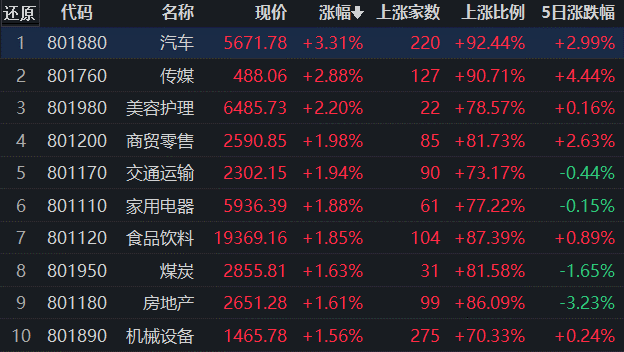 31類申萬一級行業(yè)中,有29類上漲,占比93.55%,其中,汽車漲3.31%,居首;下跌方面,僅國防軍工和銀行兩行業(yè)下跌,跌幅分別為0.49%和0.06%。