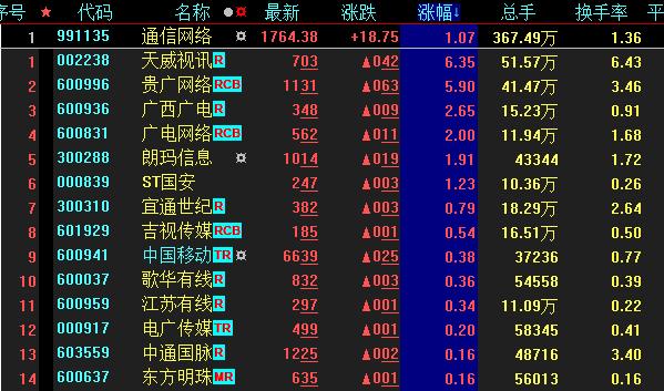 具體看,截至11月8日上午收盤,通信網(wǎng)絡(luò)板塊表現(xiàn)強勢,漲幅居首達1.07%。其中,天威視訊、貴廣網(wǎng)絡(luò)等概念股漲幅居前,均超5%。