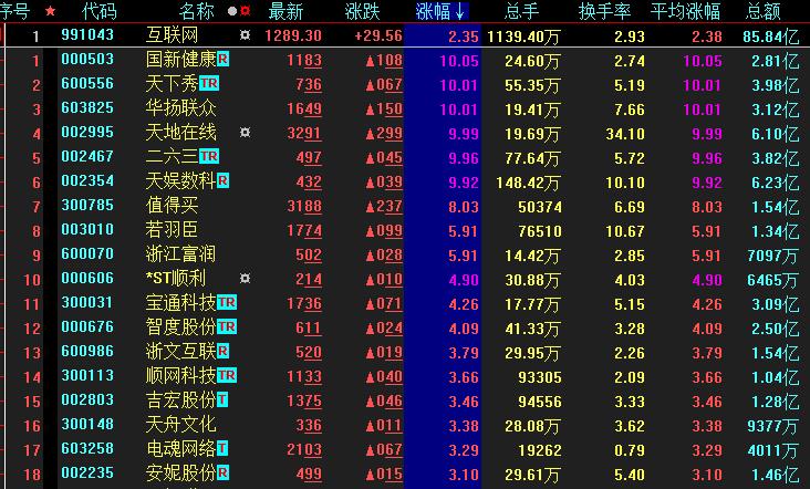 具體看,截至11月10日上午收盤,互聯(lián)網(wǎng)板塊異動(dòng)拉升,漲幅居首達(dá)2.35%。其中,國(guó)新健康、天地在線、天下秀、華揚(yáng)聯(lián)眾、二六三、天娛數(shù)科等概念股聯(lián)袂漲停。