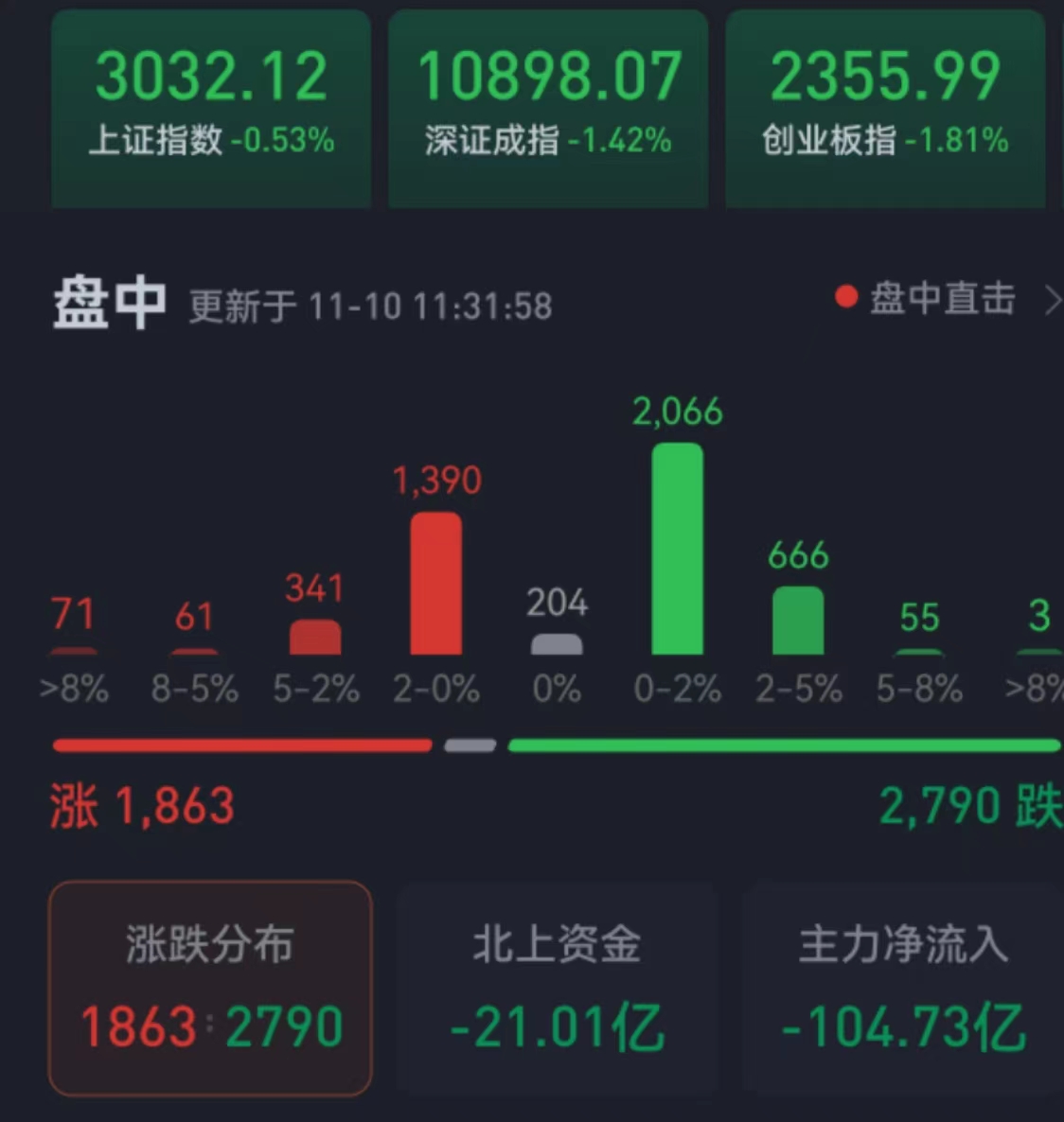 周四(11月10日),A股三大股指繼續(xù)震蕩調(diào)整。截至上午收盤,上證指數(shù)跌幅達(dá)0.53%,報(bào)3032.12點(diǎn);深證成指和創(chuàng)業(yè)板指跌幅分別為1.42%和1.81%;滬深兩市合計(jì)成交額5161.24億元,總體來看,兩市個(gè)股跌多漲少。