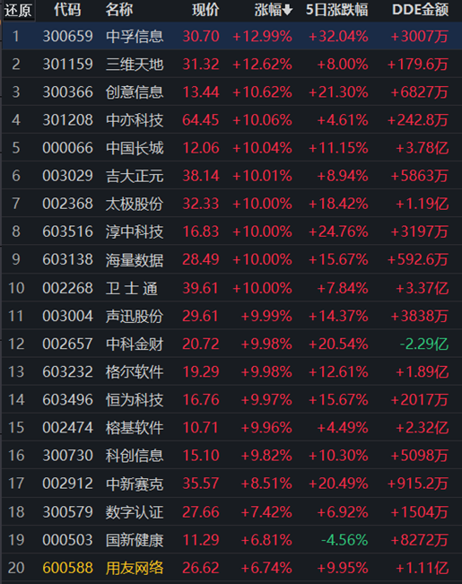 11月17日,申萬一級行業(yè)中計算機行業(yè)領漲,漲幅達2.63%,獲得24.95億元大單資金的凈流入,居資金流入行業(yè)第1位。行業(yè)中266只交易中的個股,有240只上漲,占比90.23%,其中,29只個股漲幅超5%。