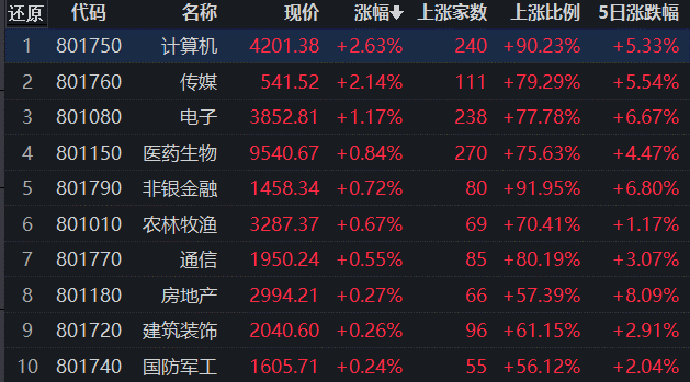 31類申萬一級行業(yè)中,有14類上漲,其中,計算機漲幅達2.63%居首,傳媒緊隨其后,也漲超2%;此外,煤炭行業(yè)跌幅居前,下跌3.38%。