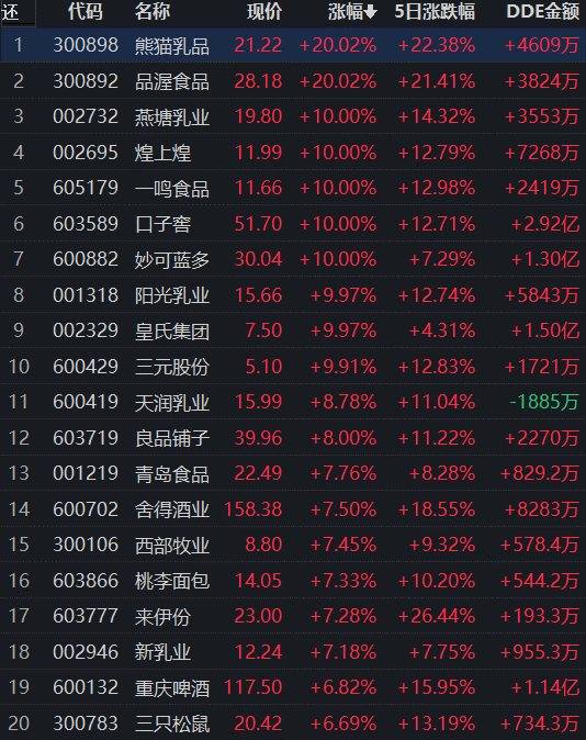 12月1日,申萬一級行業(yè)中食品飲料行業(yè)領(lǐng)漲,漲幅達3.27%,獲得29.69億元大單資金的凈流入,居資金流入行業(yè)第1位。行業(yè)中119只交易中的個股,有112只上漲,其中,37只個股漲幅超5%。