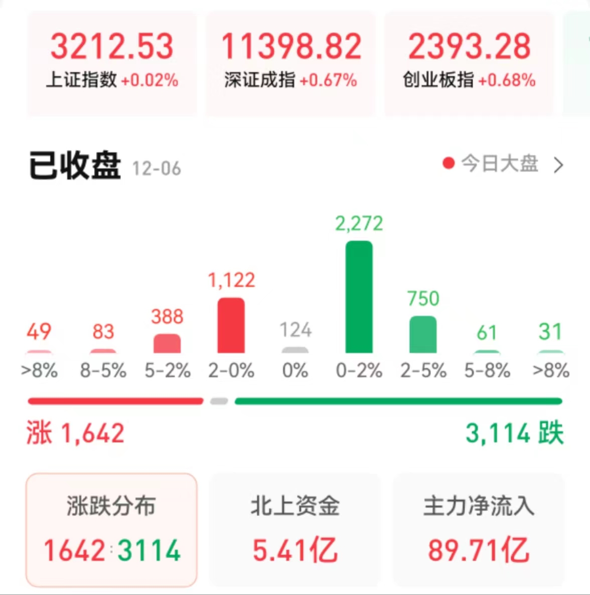 12月6日,A股三大指數(shù)震蕩攀升,全線飄紅。截至收盤,上證指數(shù)微漲0.02%報(bào)3212.53點(diǎn),深證成指漲0.67%報(bào)11398.82點(diǎn),創(chuàng)業(yè)板指漲0.68%報(bào)2393.28點(diǎn);兩市合計(jì)成交額接近萬(wàn)億元,達(dá)9982億元,北向資金凈買入5.41億元。總體上看,市場(chǎng)交投熱度略有減少,下跌個(gè)股超3000只。
