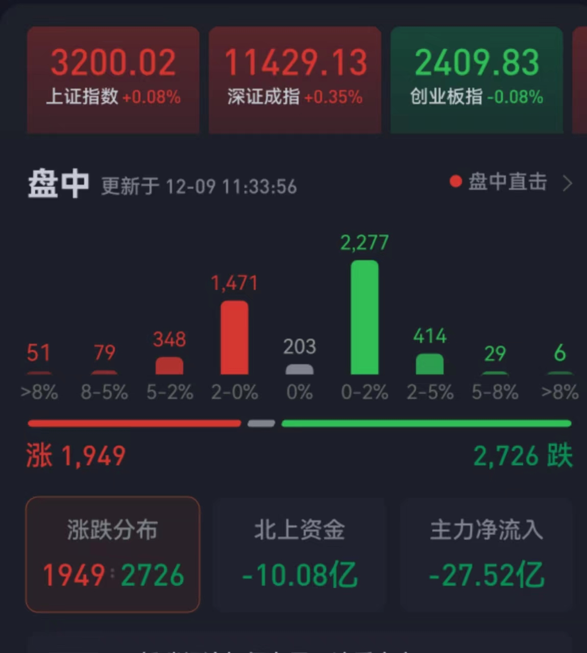 周五(12月9日),三大股指繼續(xù)震蕩分化,漲跌不一。截至上午收盤,上證指數(shù)漲0.08%,報3200.02點,收復(fù)3200點整數(shù)關(guān)口;深證成指漲0.35%,創(chuàng)業(yè)板指跌0.08%;滬深兩市合計成交額5556.9億元,總體來看,兩市個股跌多漲少。