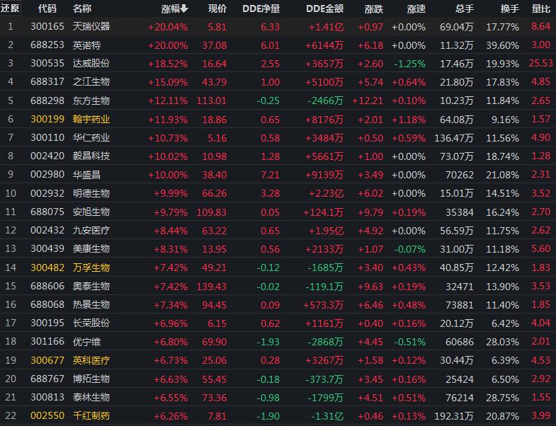具體看,截至12月9日上午收盤,抗原檢測板塊漲幅居首達(dá)5.12%。其中,天瑞儀器、英諾特、毅昌科技、明德生物等多只概念股集體漲停。