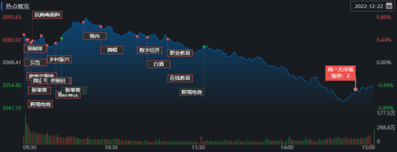 12月22日,A股三大指數(shù)高開低走,滬指開盤重回60日均線,盤中再度失守,滬指在該線已反復爭奪3個交易日。截至收盤,上證指數(shù)跌0.46%報3054.43點;深證成指跌0.33%報10876.31點,創(chuàng)業(yè)板指跌0.36%報2295.32點,A股合計成交額6579.04億元,較前一交易日增長14.65%,北向資金凈買入28.15億元??傮w上看,A股個股跌多漲少,有843只上漲,4106只下跌。