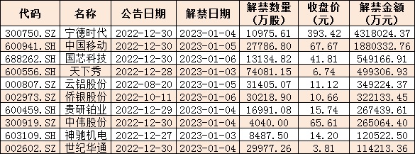 與此同時,統(tǒng)計顯示,本周(1月3日-6日)共有55家公司合計31.37億股限售股陸續(xù)解禁,按最新收盤價計算,解禁市值為932.67億元。從解禁市值來看,寧德時代(431.8億元)、中國移動(188.03億元)等公司解禁金額均超180億元。
