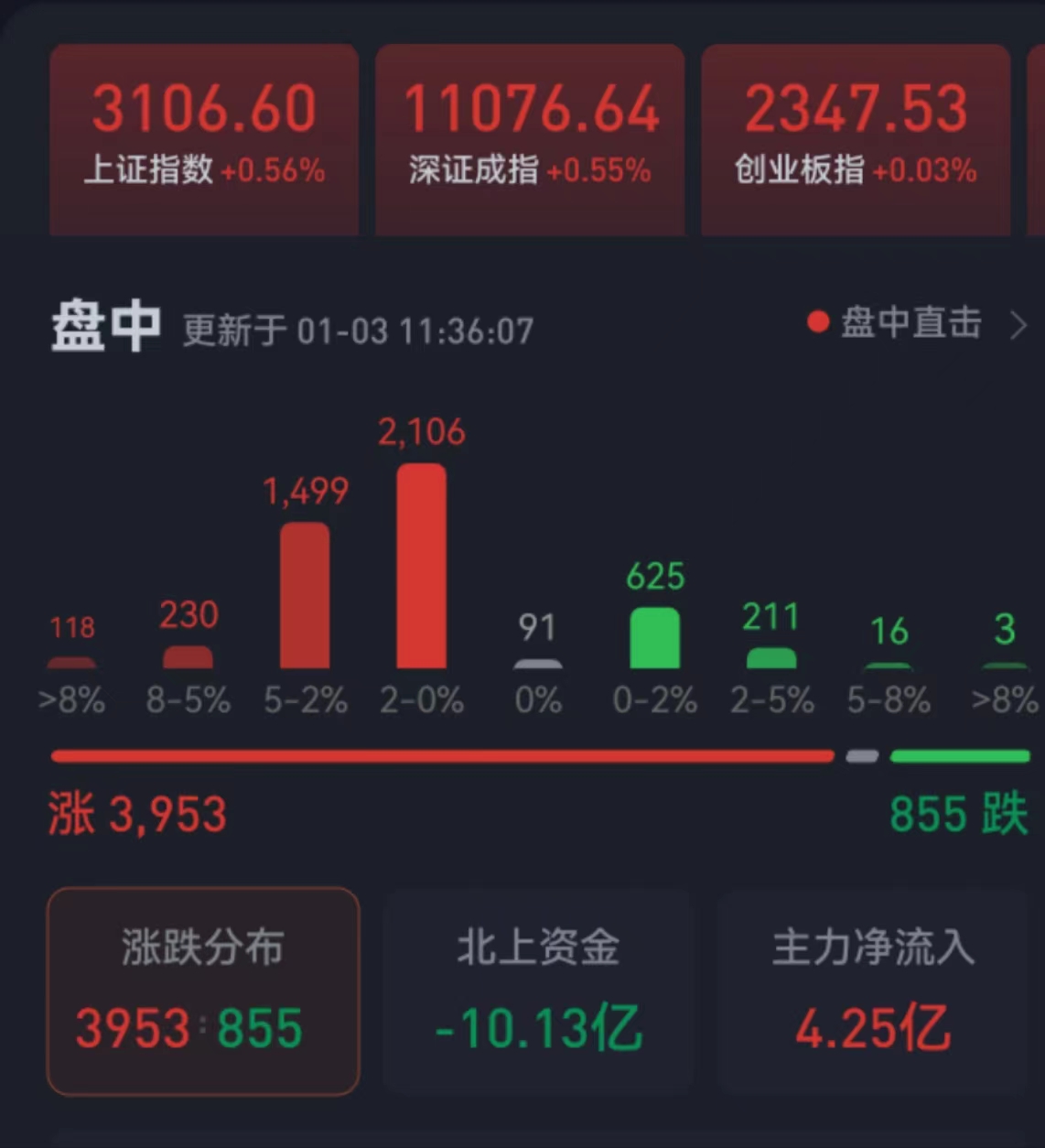 周二(1月3日),三大股指繼續(xù)震蕩走強,全線飄紅。截至上午收盤,上證指數(shù)漲幅達(dá)0.56%,報3106.60點;深證成指和創(chuàng)業(yè)板指漲幅分別為0.55%和0.03%;滬深兩市合計成交額4672.2億元,總體來看,兩市個股漲多跌少,上漲個股近4000只,其中,漲停個股達(dá)79只,跌停個股達(dá)3只。
