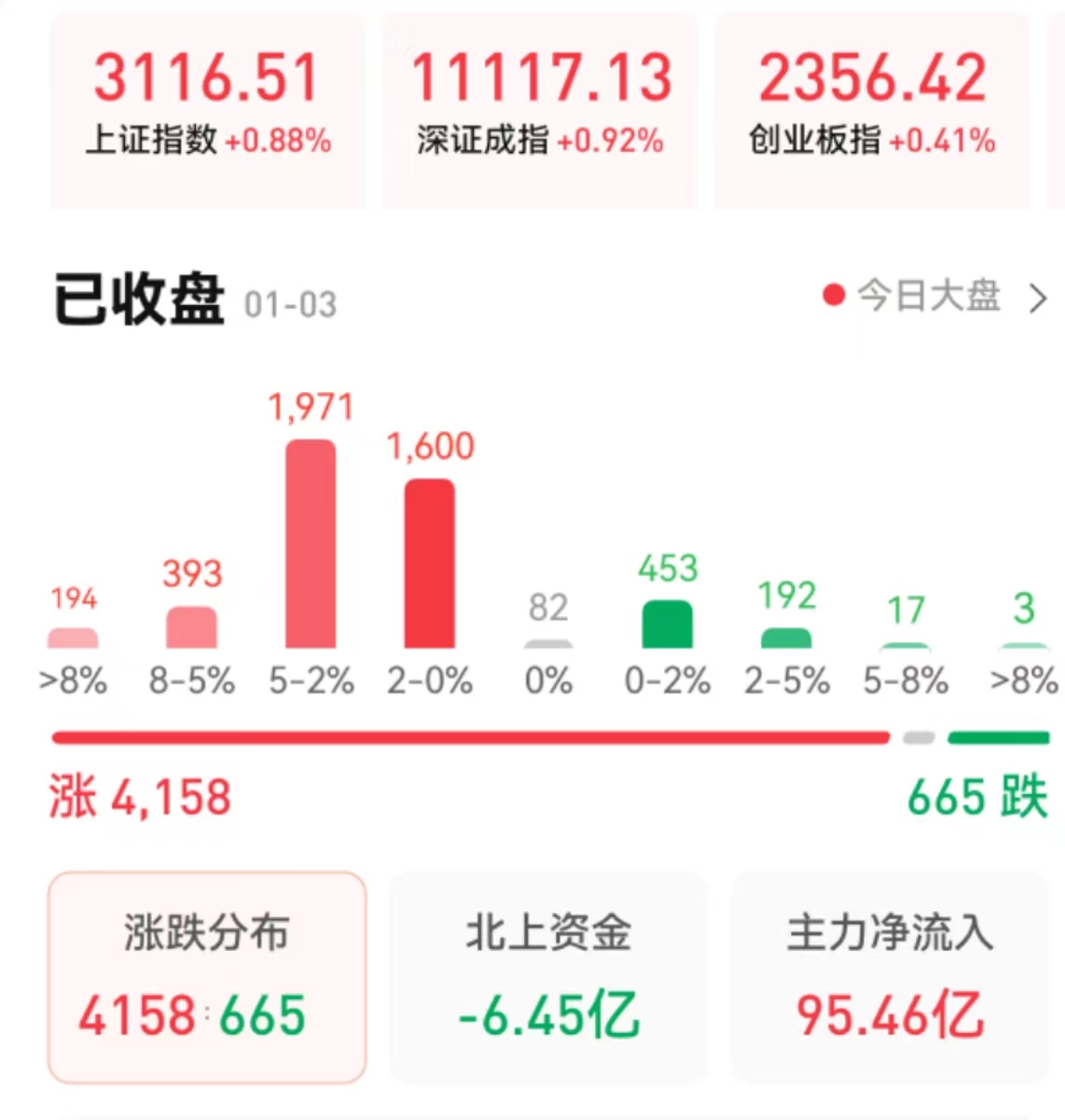 周二(1月3日),A股三大指數(shù)震蕩走強(qiáng)。截至收盤,上證指數(shù)漲0.88%報(bào)3116.51點(diǎn),深證成指漲0.92%報(bào)11117.13點(diǎn),創(chuàng)業(yè)板指微漲0.41%報(bào)2356.42點(diǎn),兩市合計(jì)成交7888億元,北向資金凈賣出6.45億元。總體上看,A股個(gè)股漲多跌少,上漲個(gè)股超4000只。值得關(guān)注的是,今日漲停個(gè)股逾百只,達(dá)116只,跌停個(gè)股有3只。
