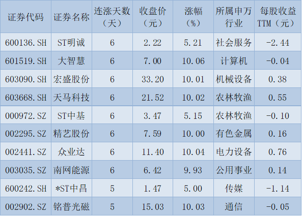 表:連續(xù)上漲5日且今日收盤漲停股一覽