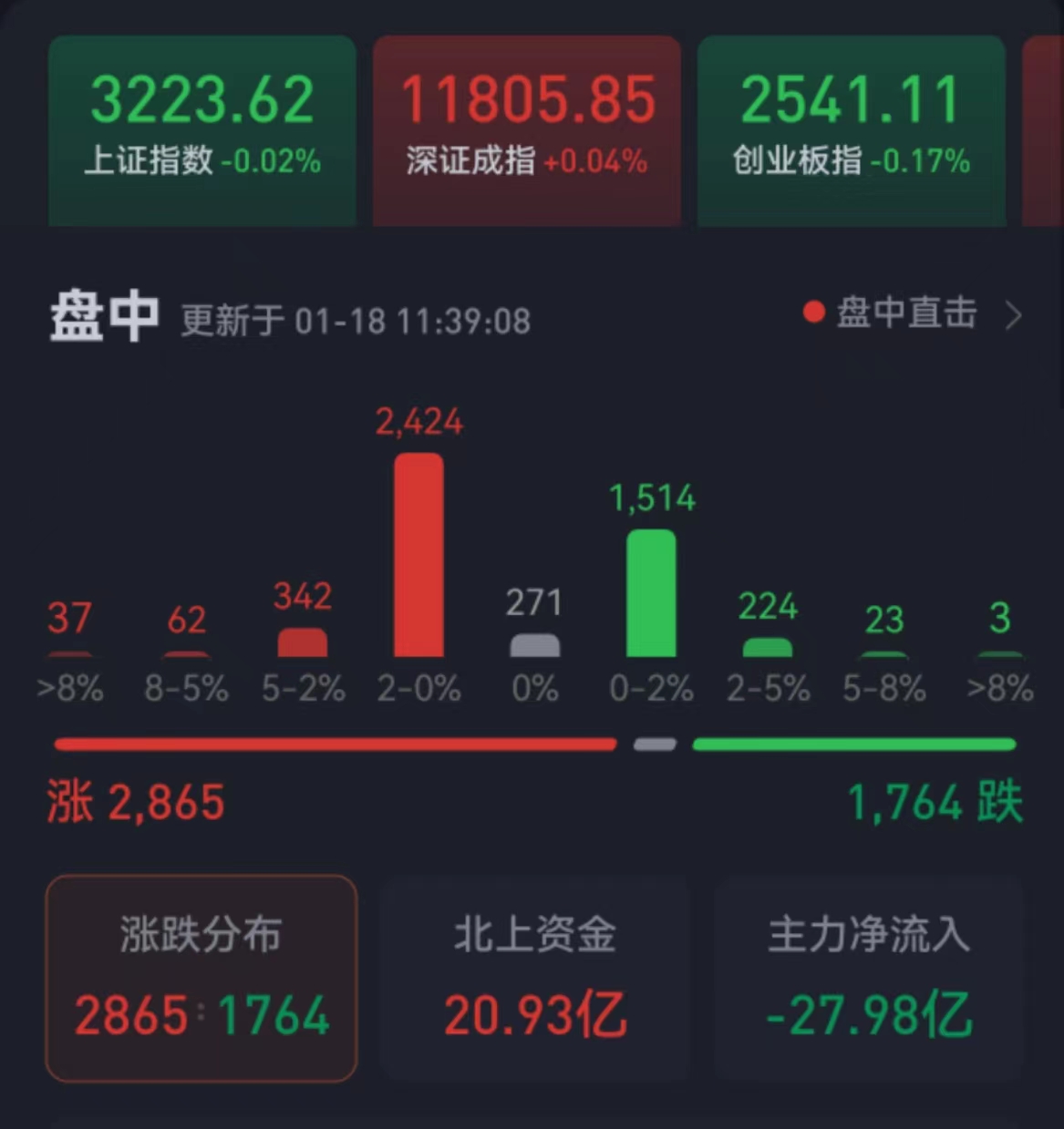 周三(1月18日)早上,三大股指橫盤波動(dòng),略有漲跌。截至上午收盤,上證指數(shù)微跌0.02%,報(bào)3223.62點(diǎn);深證成指微漲0.04%,創(chuàng)業(yè)板指跌0.17%;滬深兩市合計(jì)成交額3908.8億元,總體來(lái)看,兩市個(gè)股漲多跌少。