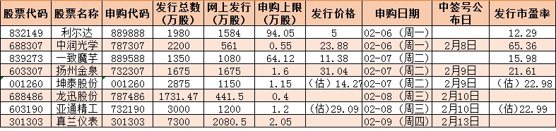 根據(jù)發(fā)行安排,下周(2月6日-10日)有8只新股發(fā)行,周一2只:利爾達、中潤光學(xué);周二3只:一致魔芋、揚州金泉、坤泰股份;周三2只:龍迅股份、亞通精工;周四1只:真蘭儀表。