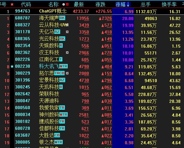 從今天的市場熱點板塊來看,ChatGPT概念板塊大幅飆升達(dá)6.99%,位居大智慧板塊的漲幅榜首位。其中,海天瑞聲、云從科技-UW、天娛數(shù)科、漢王科技、江南化工等多只概念股集體漲停。