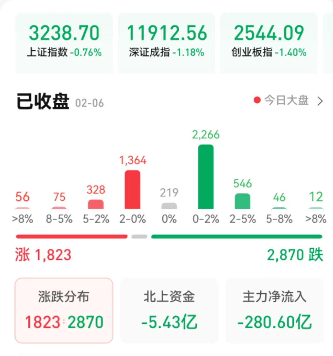 周一(2月6日),A股三大指數(shù)震蕩下行。截至收盤,上證指數(shù)跌0.76%報3238.7點,深證成指跌1.18%報11912.56點,創(chuàng)業(yè)板指跌1.40%報2544.09點;兩市合計成交額達(dá)8747億元,北向資金凈賣出5.43億元,其中,滬股通凈買入13.14億元,深股通凈賣出18.57億元??傮w上看,兩市個股跌多漲少。