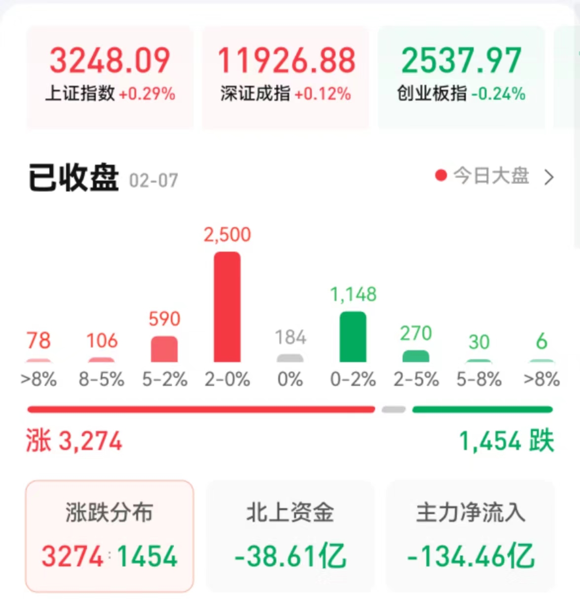 周二(2月7日),A股三大股指震蕩分化,漲跌不一。截至收盤,上證指數(shù)漲0.29%,報(bào)3248.09點(diǎn);深證成指漲0.12%,報(bào)11926.88點(diǎn);創(chuàng)業(yè)板指跌0.24%,報(bào)2537.97點(diǎn)。兩市合計(jì)成交金額達(dá)8457億元,北向資金凈賣出38.61億元。總體上看,兩市個股漲多跌少。近3300只個股實(shí)現(xiàn)上漲,其中,漲停個股達(dá)48只,跌停個股達(dá)9只。