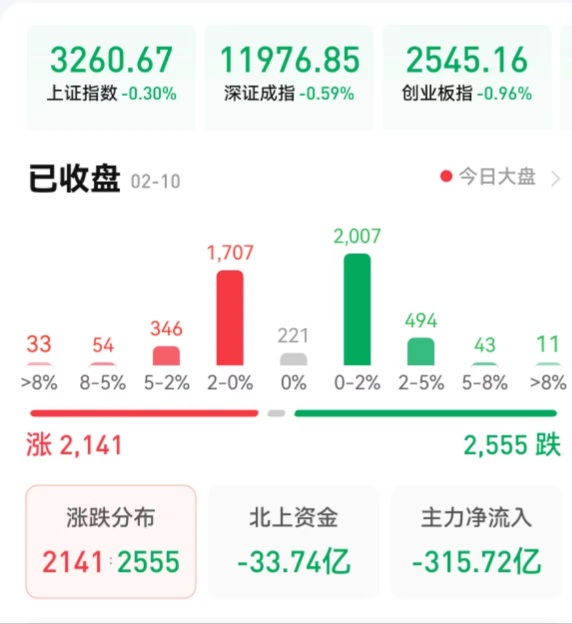 周五(2月10日),A股三大指數(shù)震蕩下行。截至收盤,上證指數(shù)跌0.30%報3260.67點,深證成指跌0.59%報11976.85點,創(chuàng)業(yè)板指跌0.96%報2545.16點;兩市合計成交8928億元,北向資金凈賣出33.74億元。總體上看,兩市個股跌多漲少。其中,漲停個股達28只,跌停個股9只。