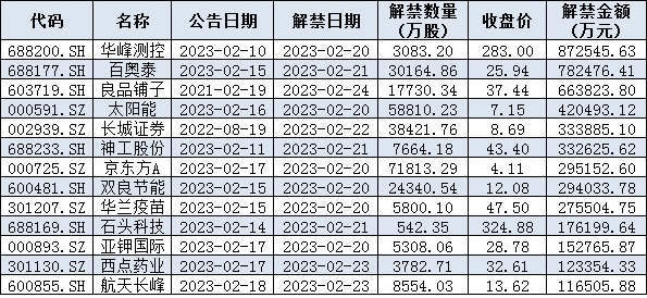 與此同時(shí),統(tǒng)計(jì)顯示,下周(2月20日-24日)共有56家公司限售股陸續(xù)解禁,按最新收盤價(jià)計(jì)算,解禁市值為559.14億元。從解禁市值來看,華峰測控(87.25億元)、百奧泰(78.25億元)、良品鋪?zhàn)樱?6.38億元)等公司解禁金額均超60億元,位居前三位。解禁股數(shù)居前三位的是京東方A(7.18億股)、太陽能(5.88億股)、長城證券(3.84億股)。