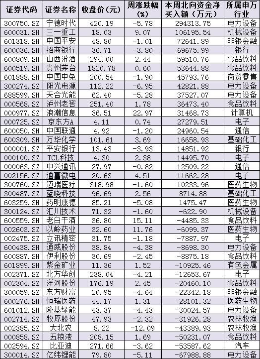 資金方面,周五,北向資金凈買入金額達(dá)20.29億元,其中,滬股通凈買入6.26億元,深股通凈買入14.03億元。本周北向資金累計(jì)凈買入金額達(dá)82.51億元。從前十大成交活躍股來看,本周,寧德時(shí)代、三一重工等2只個(gè)股,北向資金凈買入金額均超10億元。另外,億緯鋰能、比亞迪、五糧液等個(gè)股遭北向資金凈賣出金額均超5億元。