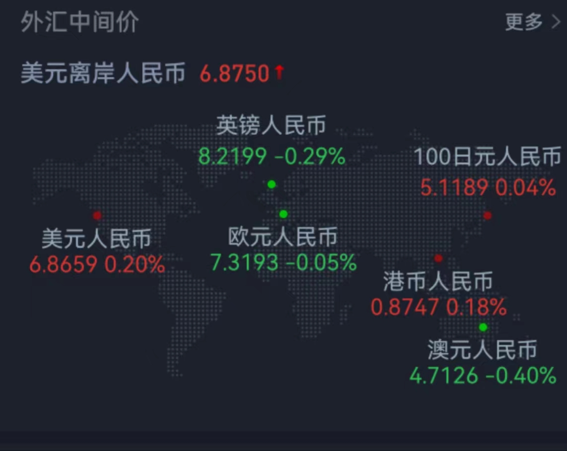 周五在岸人民幣兌美元16:30收盤報(bào)6.8818,較上一交易日跌302個(gè)基點(diǎn),本周累跌819個(gè)基點(diǎn)。人民幣兌美元中間價(jià)報(bào)6.8659,調(diào)貶140個(gè)基點(diǎn),本周累計(jì)調(diào)貶775個(gè)基點(diǎn)。在岸人民幣兌美元夜盤收報(bào)6.8661。