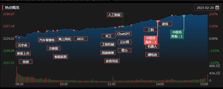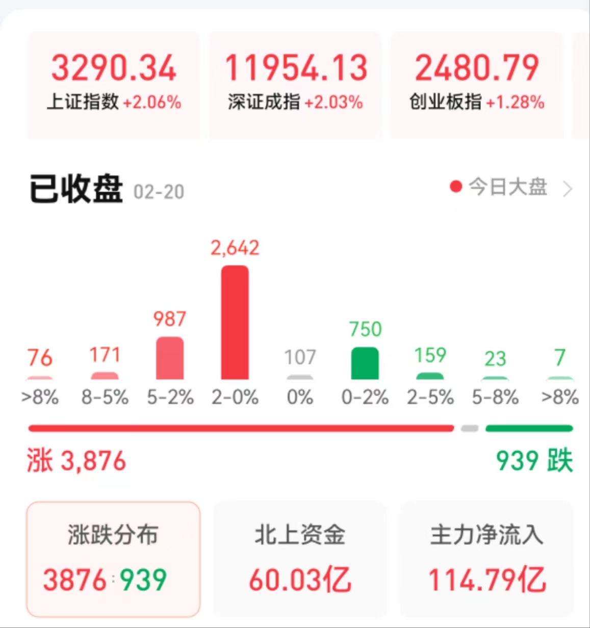 周一(2月20日),A股三大股指震蕩上行,全線飄紅。截至收盤,上證指數(shù)漲2.06%報3290.34點,深證成指漲2.03%報11954.13點,創(chuàng)業(yè)板指漲1.28%報2480.79點;兩市合計成交金額達9498億元,北向資金凈買入60.03億元,連續(xù)三個交易日凈買入??傮w上看,兩市個股漲多跌少。其中,漲停個股達41只,跌停個股達16只。