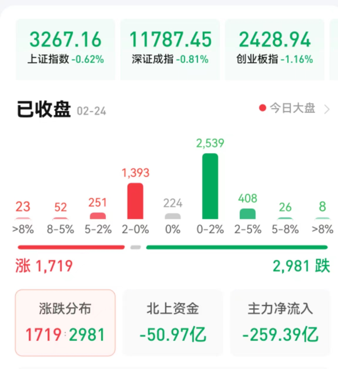 周五(2月24日),A股三大指數(shù)震蕩下探。截至收盤,上證指數(shù)跌0.62%報3267.16點,深證成指跌0.82%報11787.45點,創(chuàng)業(yè)板指跌1.16%報2428.94點;兩市合計成交7258億元,北向資金凈賣出50.97億元??傮w上看,兩市個股跌多漲少。其中,漲停個股達17只,跌停個股達6只。