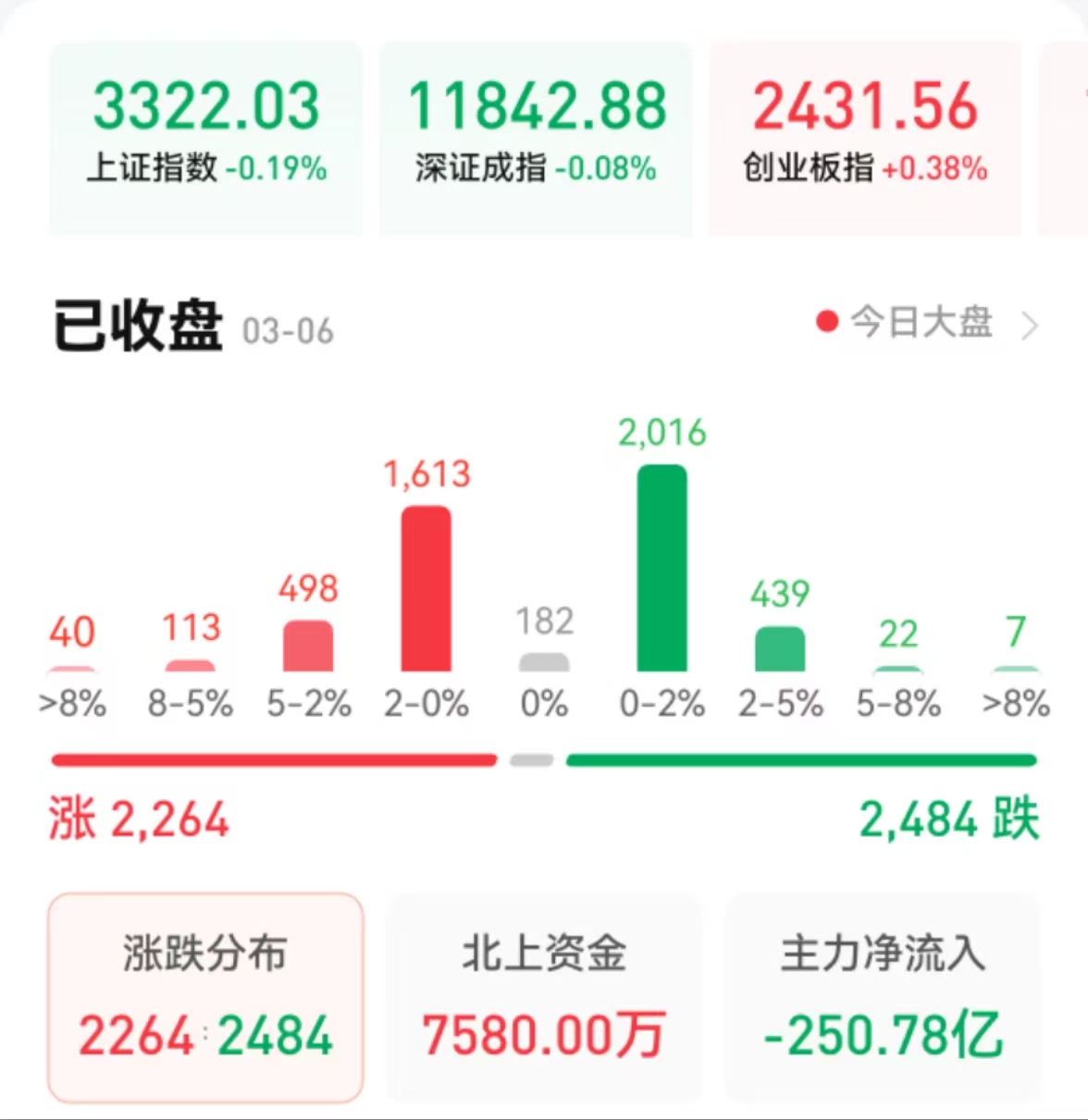 周一(3月6日),A股三大指數(shù)震蕩整理,漲跌不一。截至收盤,上證指數(shù)跌0.19%報(bào)3322.03點(diǎn),深證成指微跌0.08%報(bào)11842.88點(diǎn),創(chuàng)業(yè)板指漲0.38%報(bào)2431.56點(diǎn);兩市合計(jì)成交9509億元,北向資金凈買入7580萬元。總體上看,兩市個(gè)股跌多漲少。其中,漲停個(gè)股達(dá)31只,跌停個(gè)股2只。