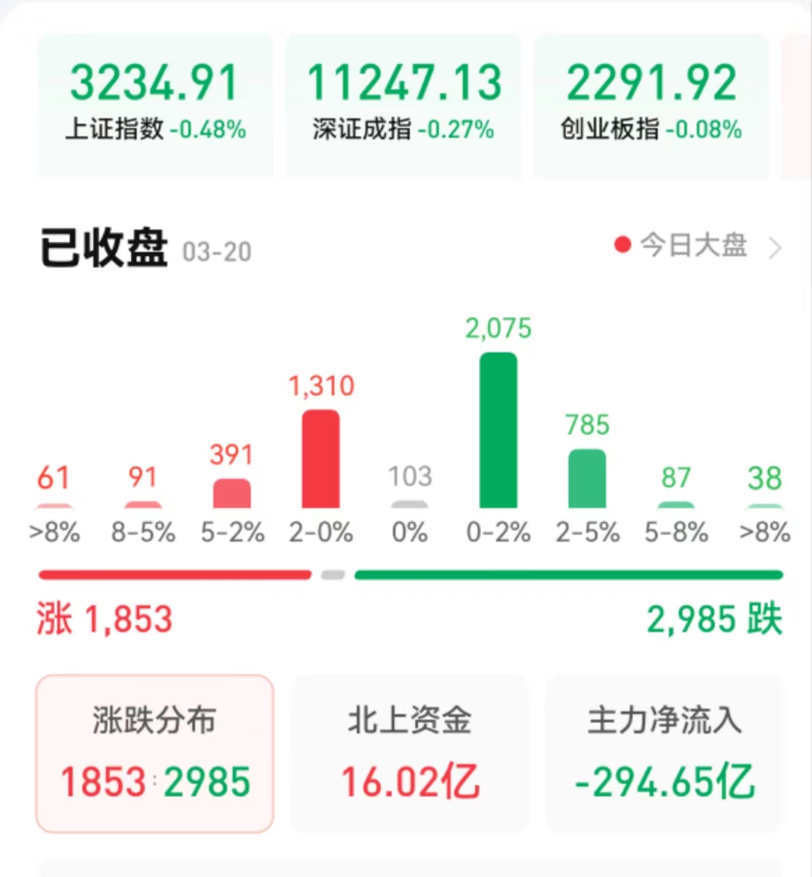 周一(3月20日),A股三大指數(shù)震蕩整理,略有回落。截至收盤,上證指數(shù)跌0.48%報(bào)3234.91點(diǎn),深證成指跌0.27%報(bào)11247.13點(diǎn),創(chuàng)業(yè)板指微跌0.08%報(bào)2291.92點(diǎn);兩市合計(jì)成交金額達(dá)10575億元??傮w上看,兩市個(gè)股跌多漲少。其中,漲停個(gè)股達(dá)25只,跌停個(gè)股達(dá)15只。