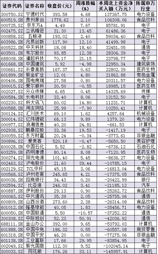 資金方面,本周北向資金累計凈買入金額達109.50億元。從前十大成交活躍股來看,本周,寧德時代、貴州茅臺等2只個股,北向資金凈買入金額均超10億元。另外,同花順、紫光國微等個股遭北向資金凈賣出金額均超10億元。