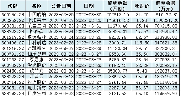 與此同時,統(tǒng)計顯示,下周(3月27日-31日)共有71家公司限售股陸續(xù)解禁,按最新收盤價計算,解禁市值為1087.4億元。從解禁市值來看,中國船舶(491.05億元)、上海萊士(110.03億元)、榮昌生物(76.02億元)、格科微(55.39億元)、騰遠鈷業(yè)(51.39億元)等公司解禁金額均超50億元。