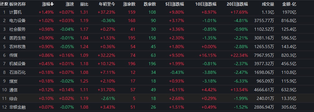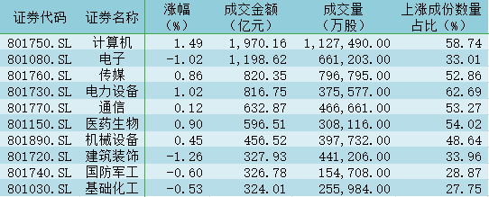 計算機、電力設備均漲超1%
