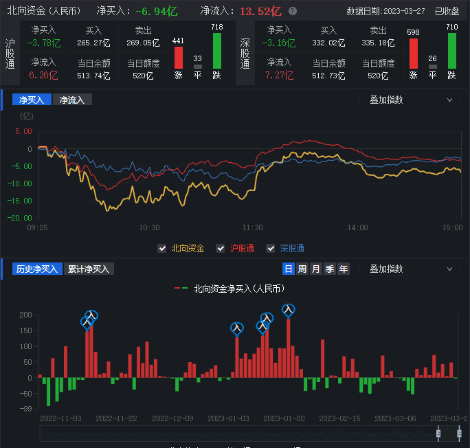 3月27日,滬深兩市三大指數(shù)震蕩分化。截至收盤,上證指數(shù)跌0.44%報3251.40點;深證成指漲0.12%報11647.94點,創(chuàng)業(yè)板指漲1.17%報2398.02點,A股合計成交額11406.49億元,較前一交易日增長6.05%;北向資金全天凈賣出6.94億元;其中滬股通凈賣出3.78億元,深股通凈賣出3.16億元。總體上看,A股跌多漲少,有1954只上漲,2944只下跌。