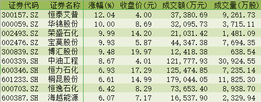 表:今日石油石化行業(yè)漲幅前十個股一覽