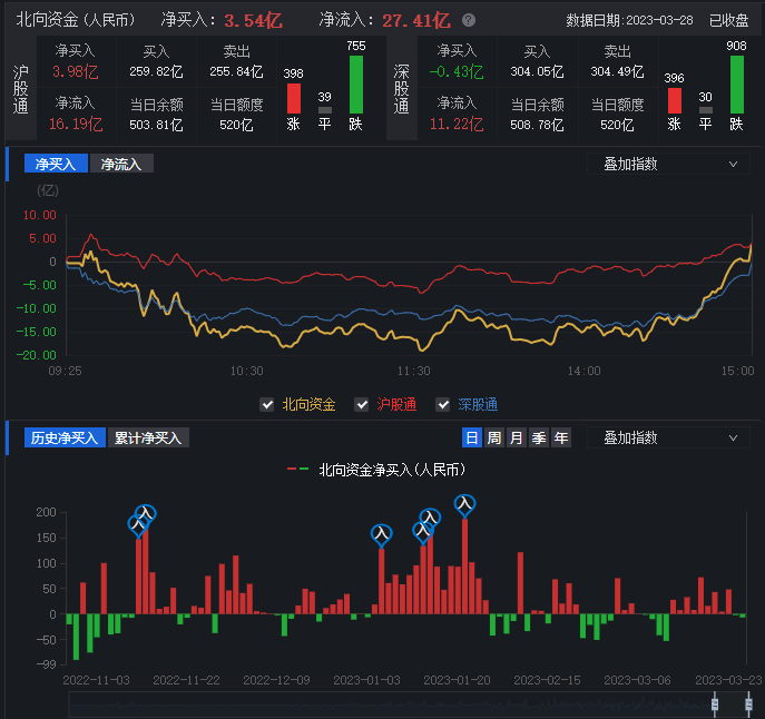 3月28日,滬深兩市三大指數(shù)集體下跌,滬指窄幅震蕩,創(chuàng)業(yè)板指止步五連漲。截至收盤,上證指數(shù)跌0.19%報3245.38點;深證成指跌0.72%報11564.45點,創(chuàng)業(yè)板指跌1.20%報2369.17點,A股合計成交額10045.17億元,已連續(xù)4個交易日突破萬億元;北向資金全天凈買入3.54億元;其中滬股通凈買入3.98億元,深股通凈賣出0.43億元??傮w上看,A股中下跌個股數(shù)量居多,有3494只下跌,1396只上漲。