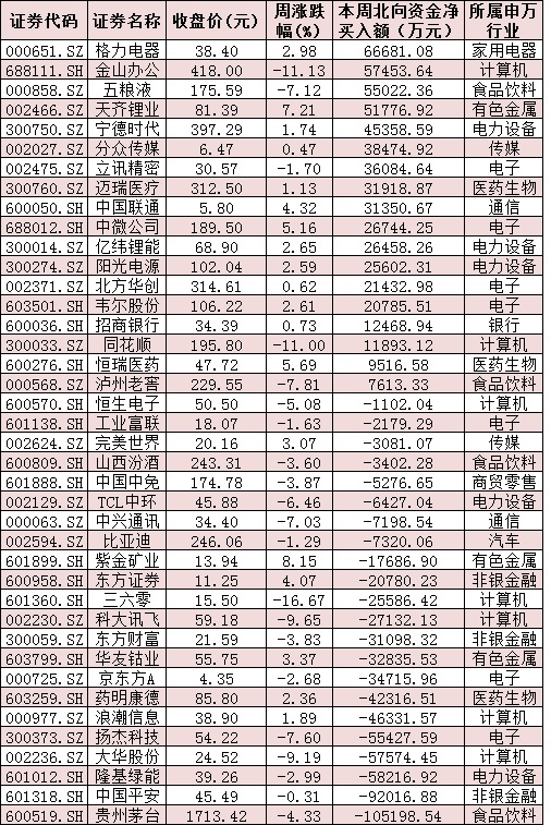 資金方面,本周北向資金累計(jì)凈買(mǎi)入金額達(dá)47.56億元。從前十大成交活躍股來(lái)看,本周,格力電器、金山辦公、五糧液、天齊鋰業(yè)等4只個(gè)股,北向資金凈買(mǎi)入金額均超5億元。另外,貴州茅臺(tái)、中國(guó)平安等個(gè)股遭北向資金凈賣(mài)出金額均超9億元。